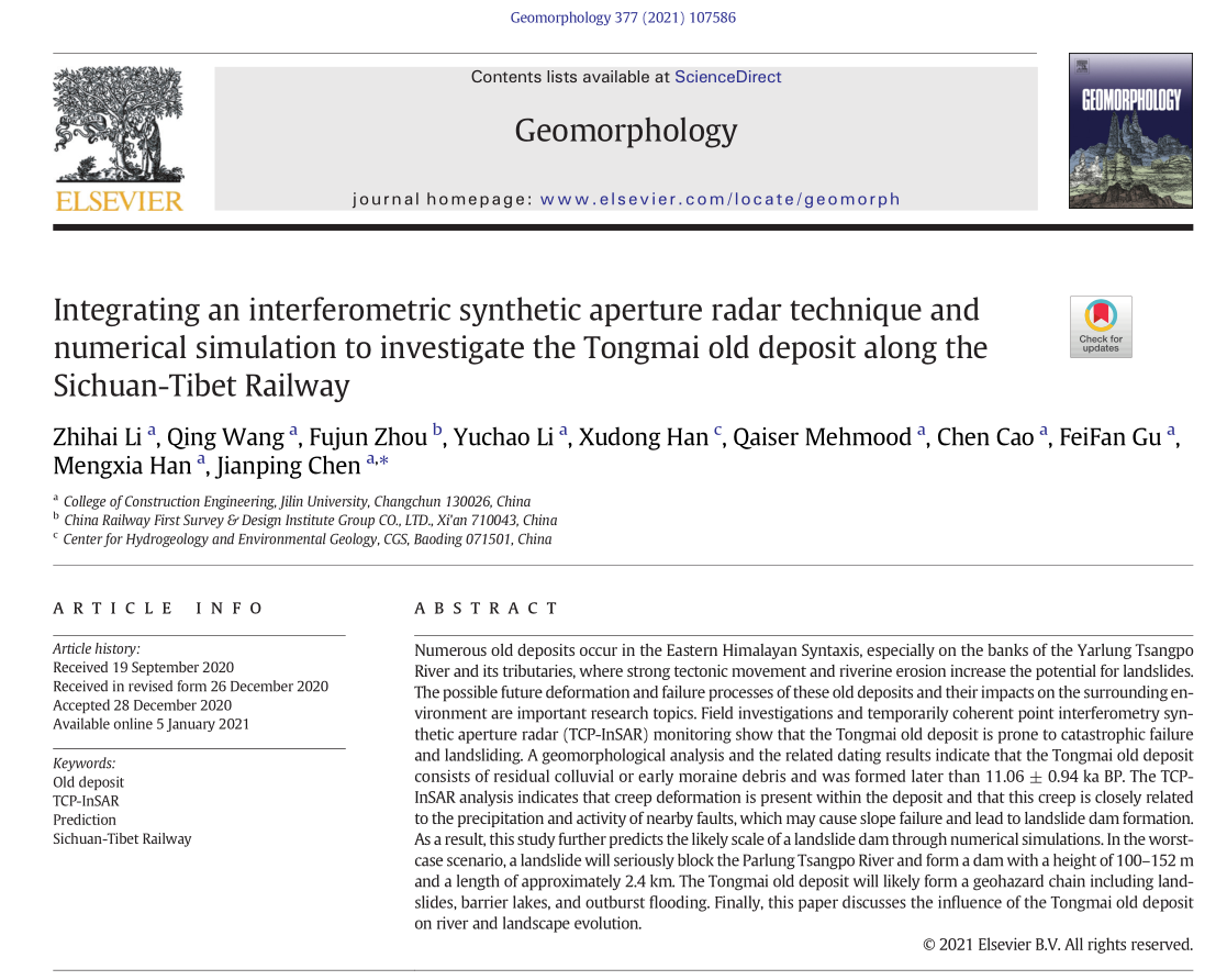 2021年1月,tyc41183太阳成陈剑平教授团队,在国际著名学术刊物《Geomorphology》上发表题目为“Integrating an interferometric synthetic aperture radar technique and numerical simulation to investigate the Tongmai old deposit along the Sichuan-Tibet Railway”的论文,阐述了新建川藏铁路通麦古堆积体成因和变形演化序列的研究成果,对川藏铁路选线和地质灾害链的认识及防治等方面具有重要的意义。