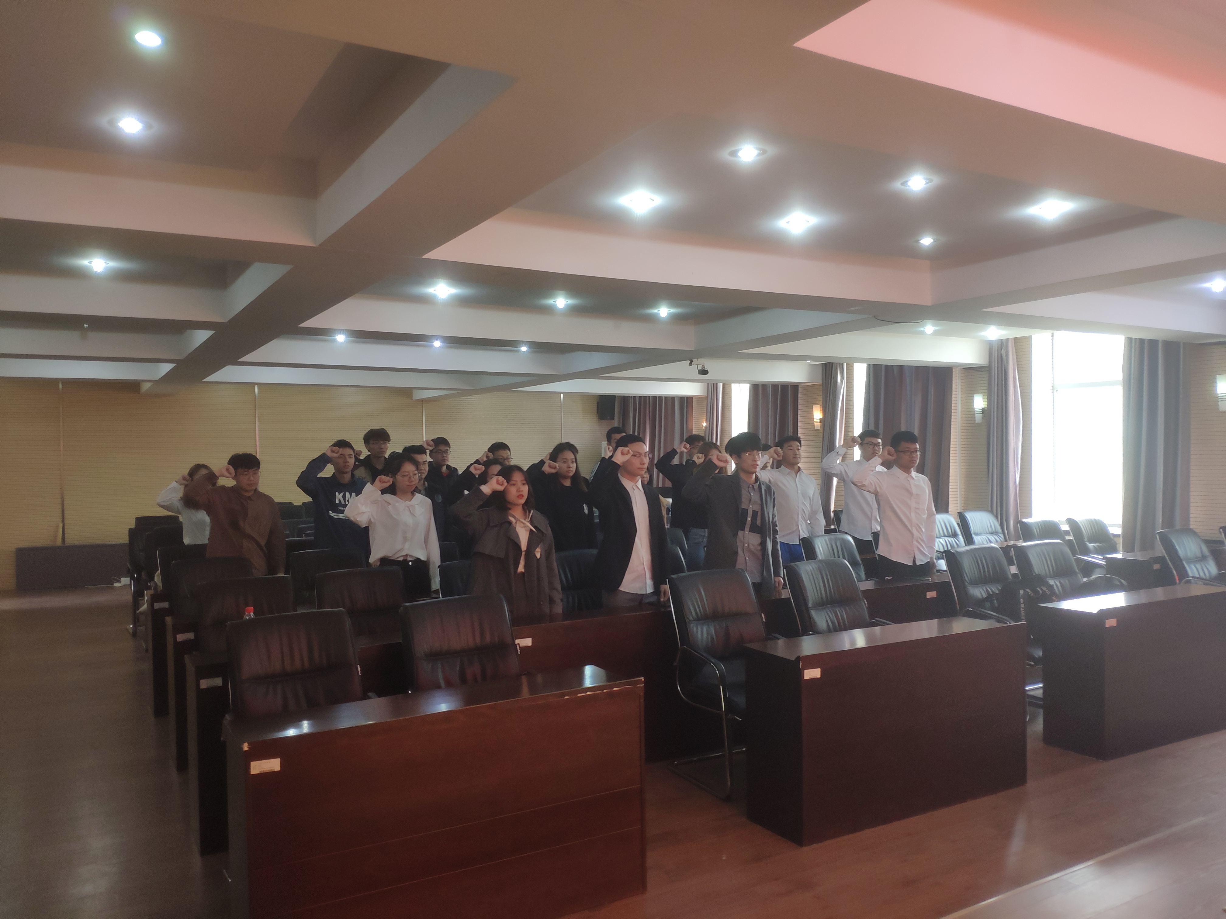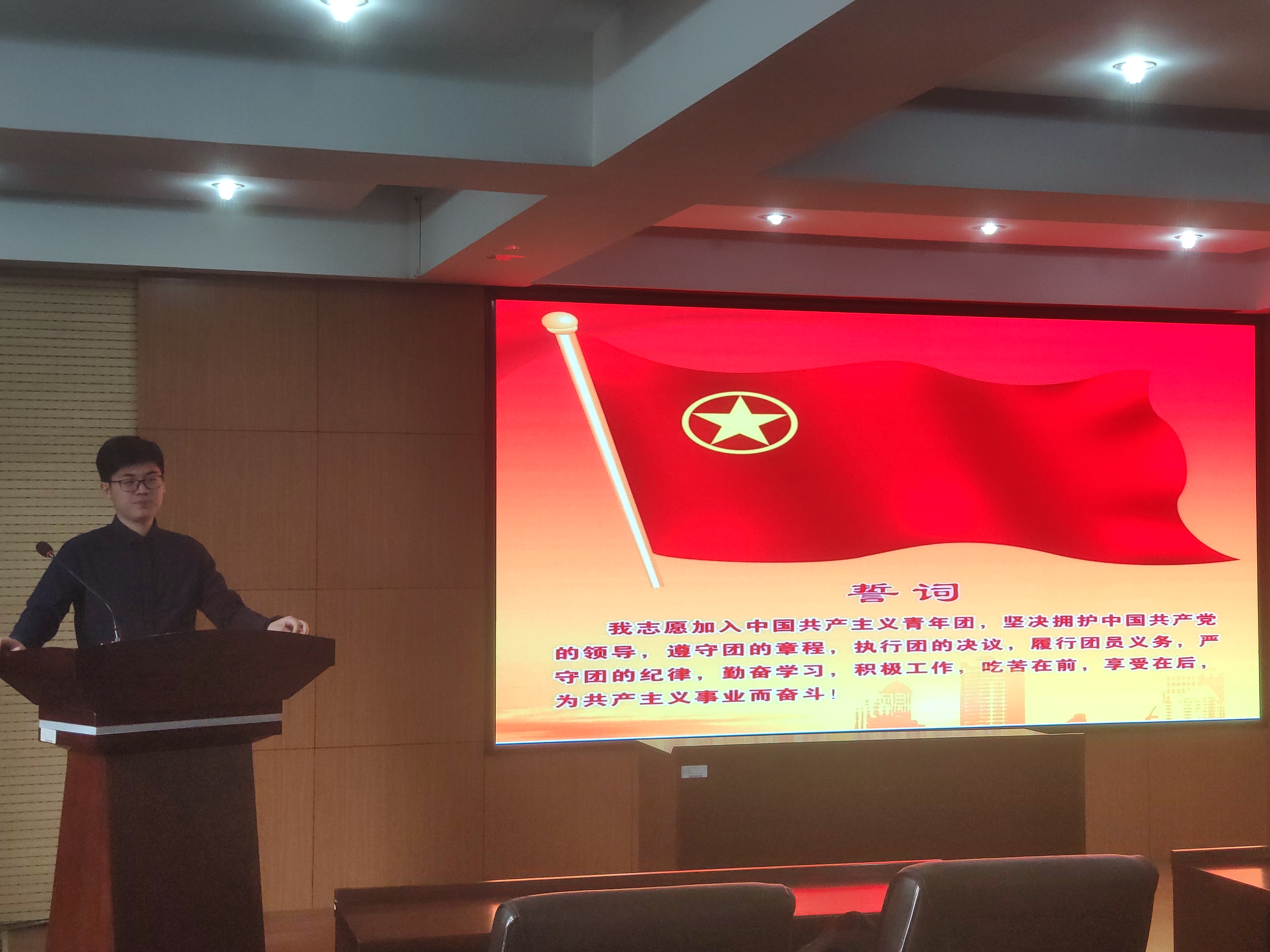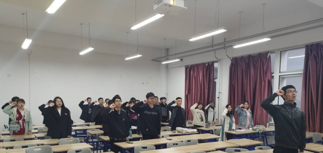 活动开始,全体成员在主持人的带领下,举起右拳,庄严宣誓。“我志愿加入中国共产主义青年团,坚决拥护中国共产党的领导,遵守团的章程,执行团的决议,履行团员义务,严守团的纪律,勤奋学习,积极工作,吃苦在前,享受在后,为共产主义事业而奋斗!”铿锵有力的誓言是共青团员们誓为共产主义事业奋斗终身的信念的体现。随后,主持人对五四运动的意义、五四精神的集中表现、共青团员的责任与义务等内容向共青团员进行了讲解与传达。随着活动步入尾声,全体成员合唱共青团团歌,嘹亮的团歌展现了青春的力量和青年团员们蓬勃奋进,积极向上的精神风貌。