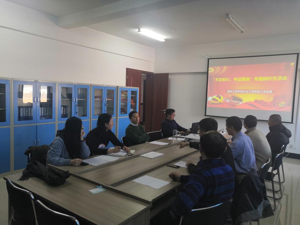 为了深入贯彻学习习近平新时代中国特色社会主义思想,相应公司和公司党委的号召,tyc41183太阳成石油工程系教工党支部于12月19日下午在朝阳校区钻采楼529召开了“不忘初心、牢记使命”专题组织生活会并开展了民主评议党员工作。支部全体党员参加了会议。