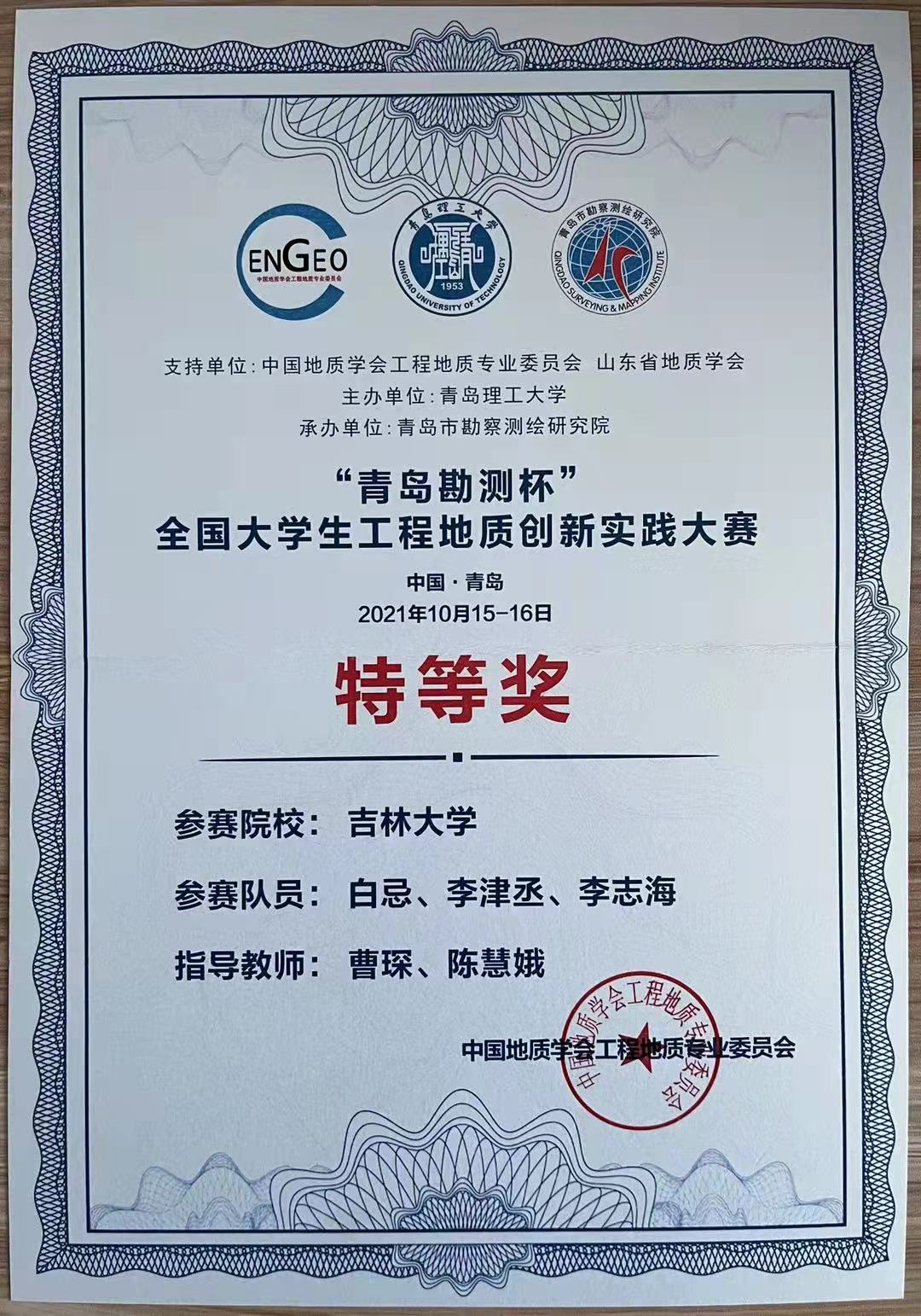 2021年10月15日,首届全国老员工工程地质创新实践大赛在青岛举行。公司曹琛、陈慧娥老师共同指导的白忌、李津丞和李志海同学参赛组斩获大赛特等奖;宋盛渊、徐鑫老师共同指导的罗永桂、雷浩民和李玉超同学参赛组荣获大赛二等奖。