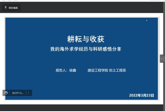 系列讲座第一期于3月23日19:00通过腾讯会议线上召开,主讲嘉宾是公司岩土工程系博士生导师徐鑫副教授,主题为《耕耘与收获——我的海外求学经历与科研感悟分享》。讲座由公司副经理王伯昕主持,执行经理郭威发表了热情洋溢的讲话,各专业教师、公司本科生、研究生近150人在线参加讲座。