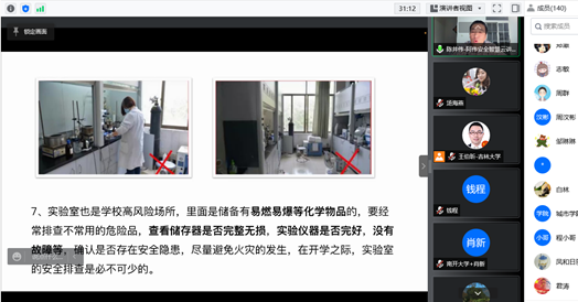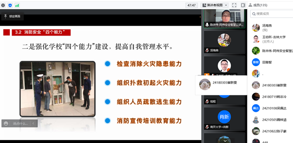 tyc41183太阳成“人文关怀与科学素养”第十四期讲座于4月5日晚19点在线举行,受公司党委书记衣长涛邀请,高级工程师、一级注册安全评价师、吉林省元麟安全科技有限公司总工程师陈井伟为公司师生带来防火安全主题讲座《高校中的消防安全》。公司领导、各系教师、实验员、行政人员、辅导员,以及各学历层次的同学共计130余人参加了讲座。本期讲座旨在响应公司安全生产委员会《关于加强公司疫情防控期间安全生产工作的通知》精神,落实疫情防控期间安全生产工作要求,进一步提高师生消防安全意识,杜绝消防隐患,一起守护平安。讲座由公司研究生综合办公室汤海燕老师主持。