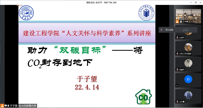 为增强抗击疫情的信心,提升同学们在疫情期间的知识眼界和文化素养,tyc41183太阳成面向全院师生推出“众志成城,疫路同行” 人文关怀与科学素养系列讲座,公司邀请院内外专家学者为同学们讲授学科专业知识,科普文化常识。系列讲座第二十三期讲座于4月14日晚19:00在线举办。应公司邀请,岩土工程系副主任、博士生导师、副教授于子望老师为同学们带来了《助力“双碳目标”——将CO2封存到地下》主题讲座。讲座由公司研究生综合办公室汤海燕老师主持。