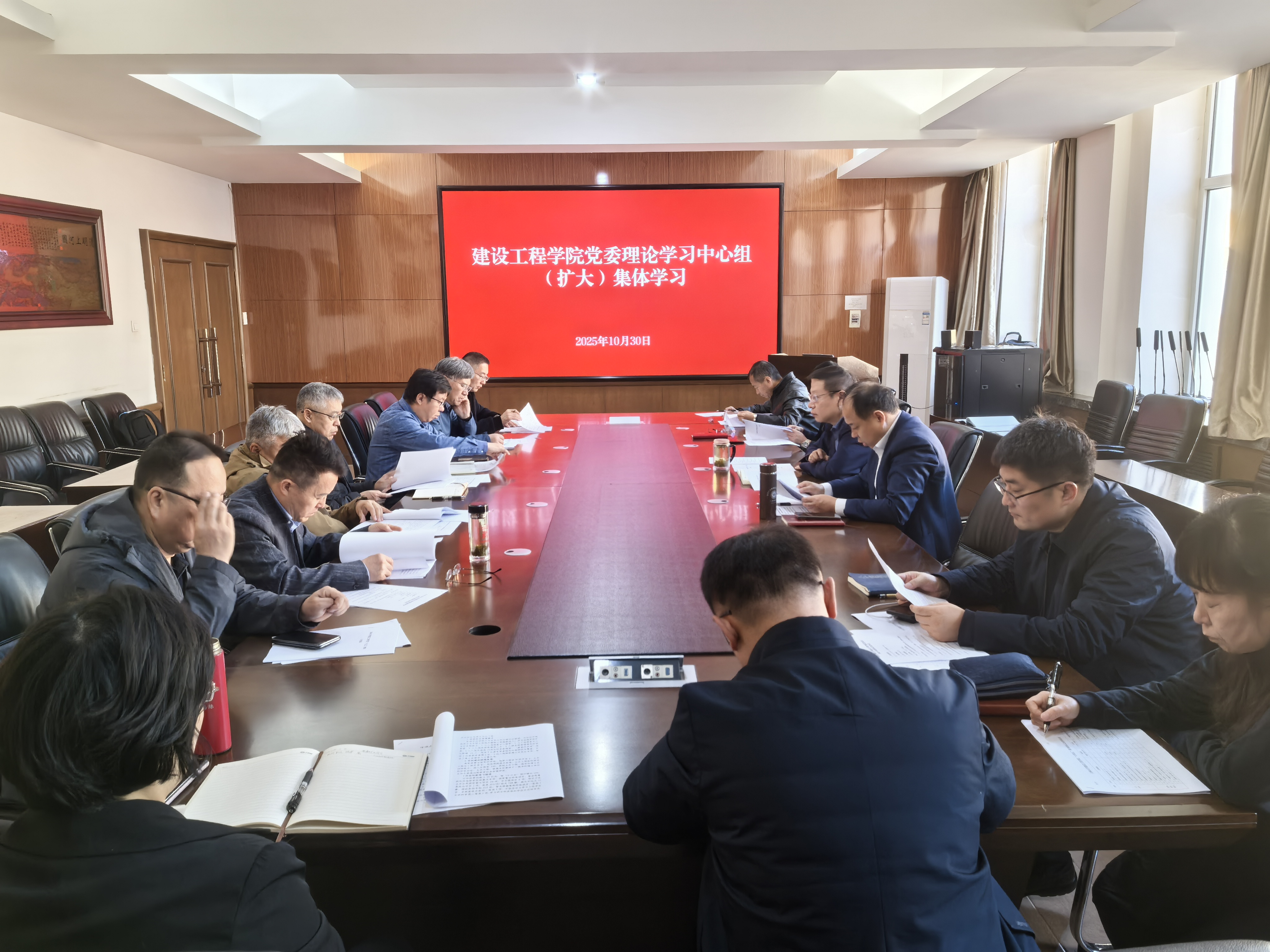 10月30日上午,建设工程公司党委在水工楼319会议室召开了党委理论学习中心组(扩大)集体学习会议,公司党委委员、领导班子成员、三委会负责人、教工党支部书记、系、所(中心)负责人参加了会议,会议由公司党委书记杨洲主持。