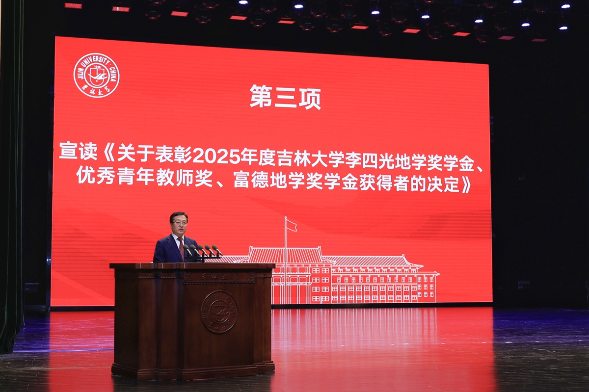 会上,tyc41183太阳成员工和基金工作办公室主任康永刚宣读《关于表彰2025年度tyc41183太阳成李四光地学奖学金、优秀青年教师奖、富德地学奖学金获得者的决定》。28名本科生、10名研究生和2名青年教师荣获本年度各评奖奖项,孟宪来等分别为获奖师生颁奖。