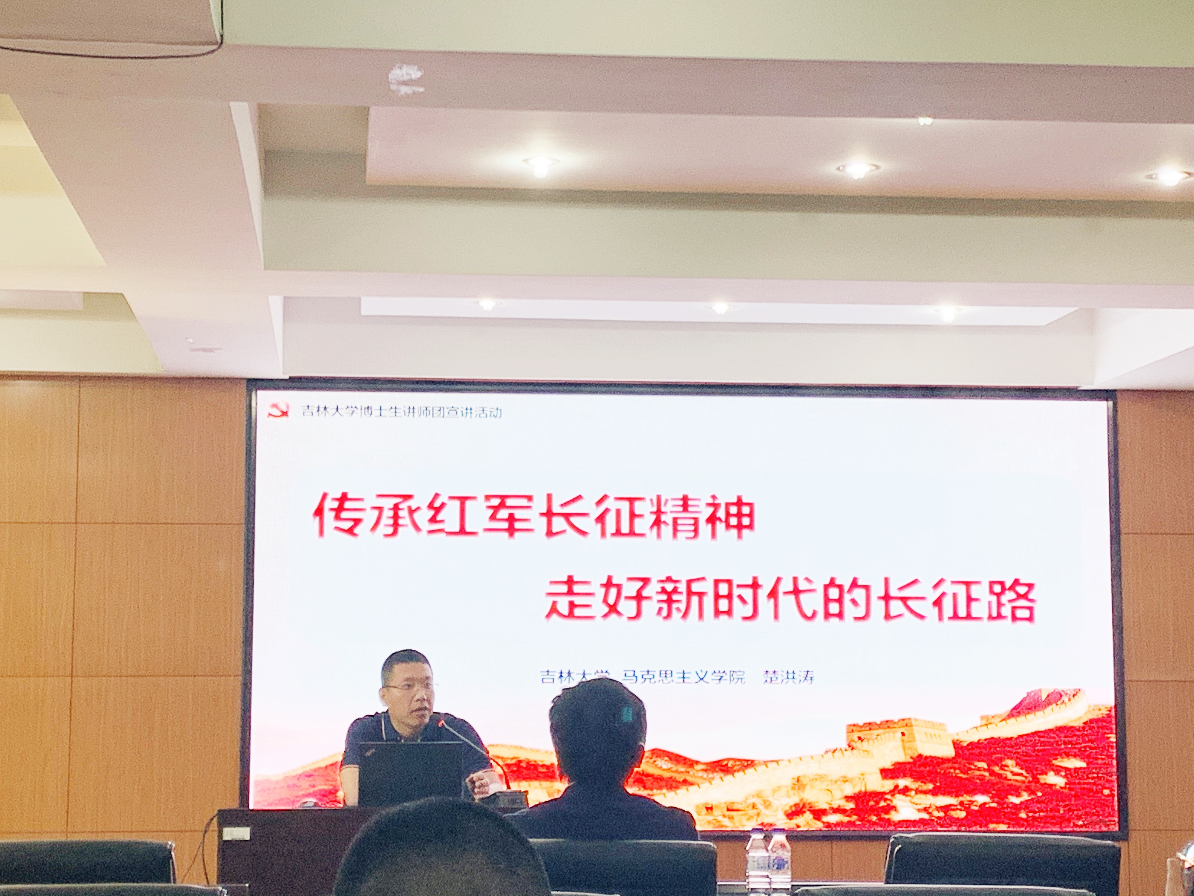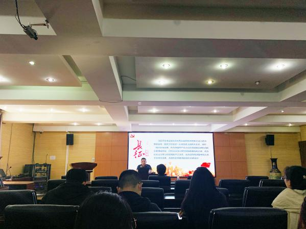 随后,楚洪涛为研究生讲述了遵义会议、四渡赤水、巧渡金沙江以及强渡大渡河。随后,楚洪涛老师由经典的历史人物引出五种长征精神:把全国人民和中华民族的根本利益看得高于一切,坚定革命的理想信念,坚信正义事业必然胜利的精神;为了救国救民,不怕任何艰难险阻,不惜付出一切牺牲的精神;坚持独立自主、实事求是,一切从实际出发的精神;顾全大局、严守纪律、紧密团结的精神;紧紧依靠人民群众,同人民群众生死相依、患难与共、艰苦奋斗的精神。最后,楚洪涛号召研究生党员纪念长征、弘扬长征精神,用长征精神强大我们的内心,担当我们的责任。面对工作、生活中的巨大压力,我们时刻铭记“苦不苦,想想红军两万五”的革命箴言。唯有铭记初心,时刻警醒,不被骄傲自满缠住前进的脚步,才能不断开创中国梦新境界,在新的起点上从零开始,踏步向前,争取新的胜利。